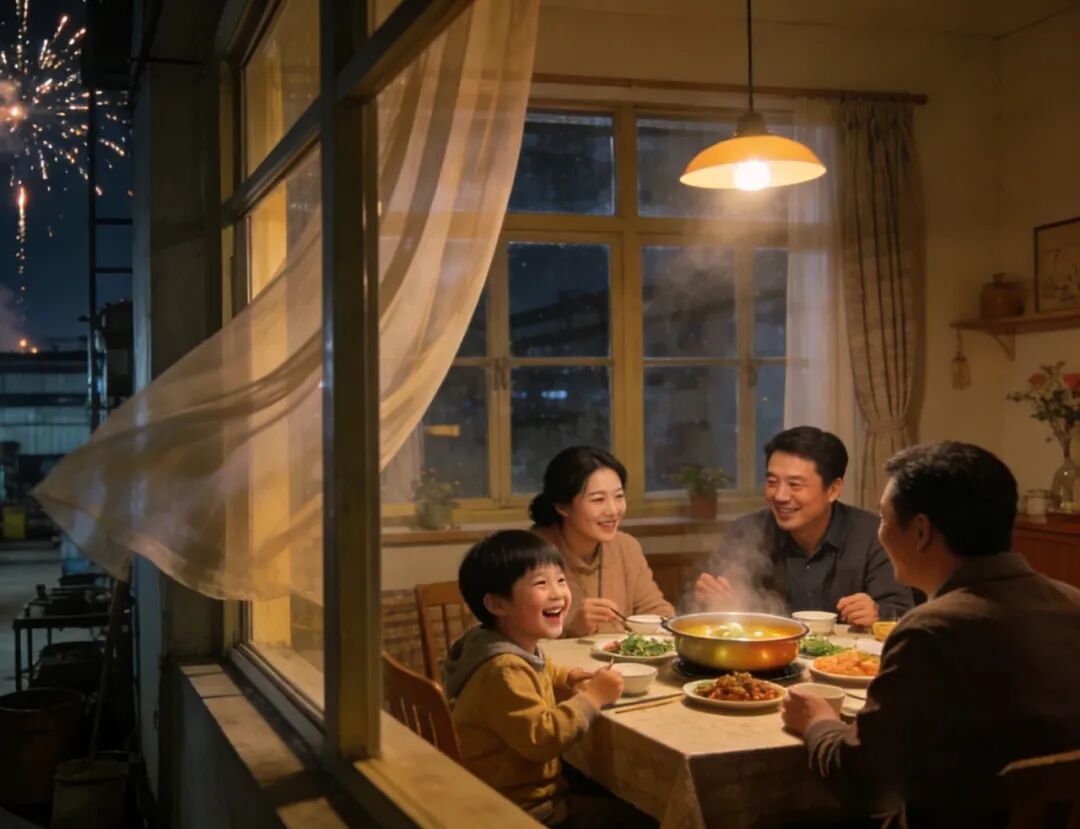 厨房的炖锅咕嘟着暖意,电视里的春晚唱着热闹,爱人递来一颗糖,孩子扑进怀里撒着娇。就像车间里我们并肩时的默契,此刻的团圆,也从不需要宏大的语言…… 只是海乾威人与家人相守,就很好。